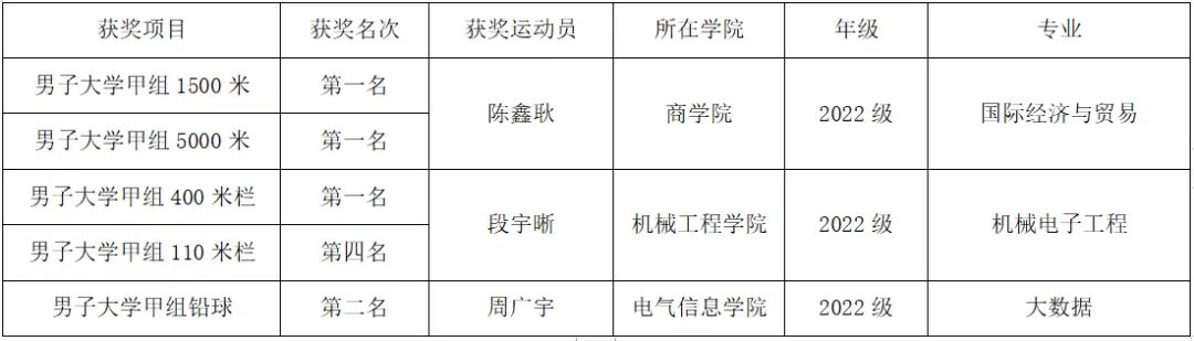 男子甲组400米跨栏赛场同样精彩。我校机械工程学院机械电子工程专业的段宇晰同学跑出了59.56秒的成绩,夺得冠军。这个成绩同时也达到了国家二级运动员的标准。值得一提的是,他是甲组男子400米跨栏比赛中唯一一个打破一分钟的运动员。