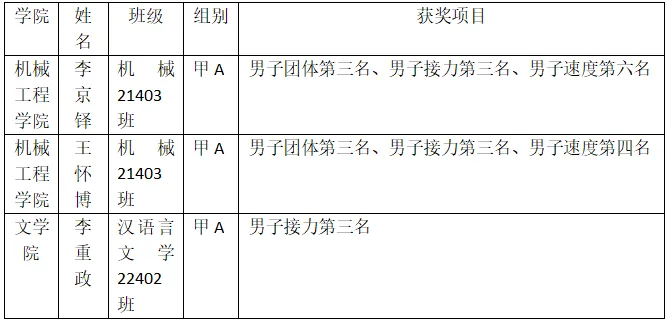 我校运动员在教练员韩琦、侯雪老师的带领下,努力拼搏,团结协作,通过激烈角逐,在本次比赛中共荣获三枚铜牌和一个团体总分第三的好成绩,创我校全国攀岩比赛历史获得最多奖牌的记录,充分发扬了我校的体育精神,展现了当代大学生的时代风貌。
