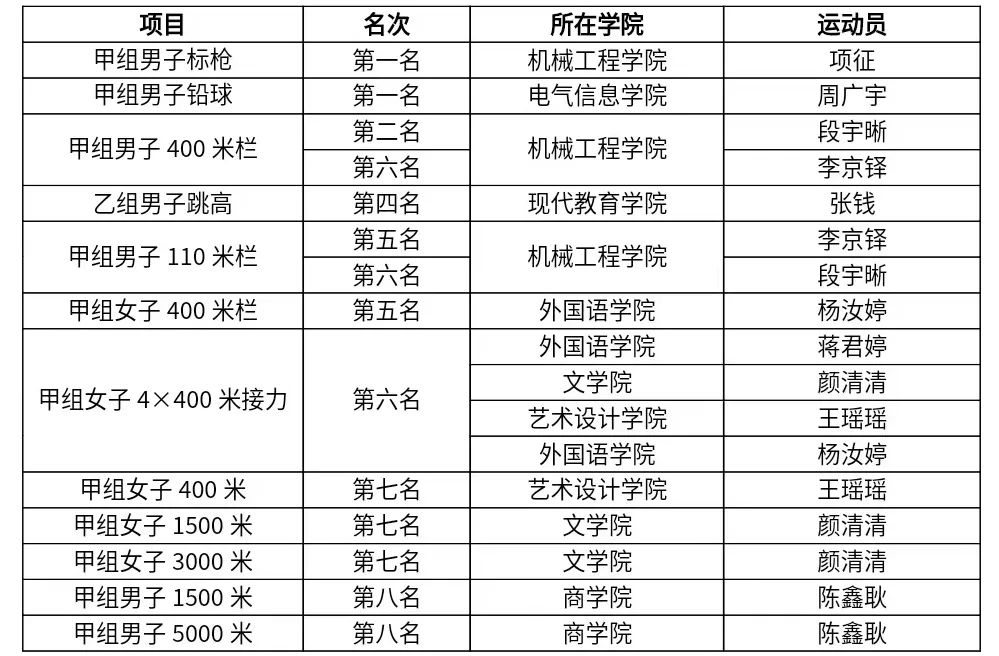 长春光华学院代表队的选手来自校内7个学院,他们在比赛中,共获得金牌2枚、银牌1枚,第四、五、六、七、八名分别为1次、3次、3次、2次、2次。最后,位列男子甲组团体总分第5名,甲组团体总分榜第8名。虽然我校仅有14名运动员参赛,却在22个项目的比赛角逐中取得了14个名次,并在多个项目表现出彩。机械工程学院智能机电技术专业项征同学获得甲组男子标枪项目的金牌并打破了他在第吉林省十九届运动会中创造的赛会纪录,电气信息学院大数据专业周广宇同学在比赛斩获阳光组男子铅球比赛冠军,创造了我校男子铅球历史最好成绩。本次锦标赛自2024年6月13日开始,历时5天、4个比赛日。公共体育教研部和现代教育学院体育教育专业全体教练员们不辞辛苦,放弃个人休息,利用学生的课余时间,对运动员悉心指导,本着敬业、奉献的精神,投身于训练和比赛指导中去,倾囊相授比赛经验,助力运动员们取得优异的运动成绩。